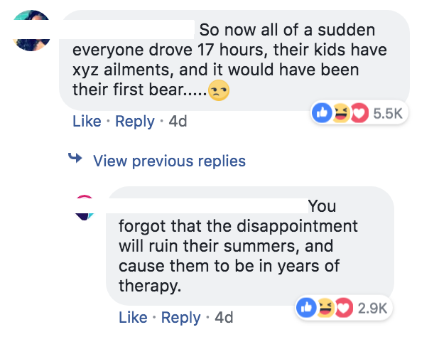 Others who did wait in line were not so empathetic. "So now all of a sudden everyone drove 17 hours, their kids have XYZ Ailments, and it would've been their first bear . . . (preterbed emoji)."